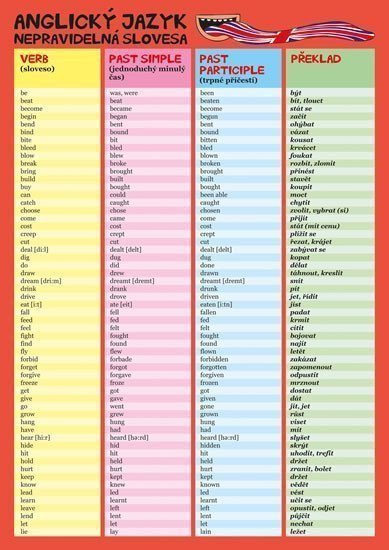 This laminated card, primarily intended for elementary and high school students, offers a visually clear and concise overview of the most commonly used English irregular verbs and their forms in the past tense and past participle.
