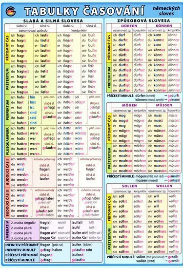 Clear tables of all German verb tenses for weak, strong, modal, and auxiliary verbs. Contains indicative mood, subjunctive, imperative, indefinite verb forms, color-coded endings, and irregularities.