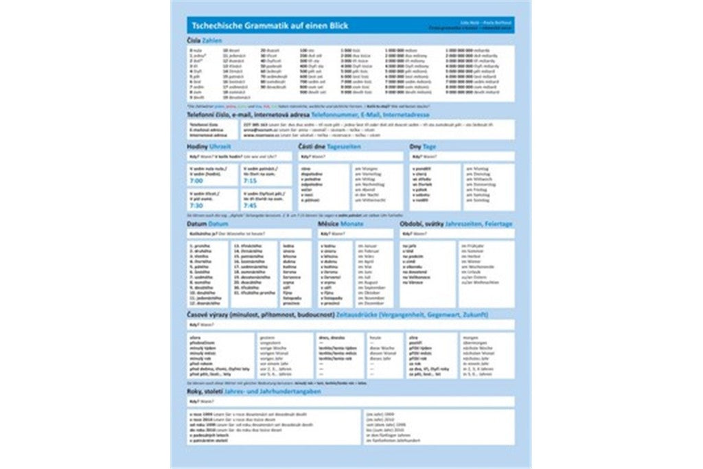 A four-page guide slightly larger than A4, printed on double-sided laminated paper. Its updated, expanded version from 2010 is intended for beginners and intermediate students of Czech as a foreign language, although advanced speakers will also find it useful for occasional reference. It provides a simple overview of basic grammatical and lexical phenomena important for successful everyday communication, which is always at hand. It does not mechanically copy traditional grammatical rules but adapts the explanation to the perceptions and needs of foreign language speakers (for example, it uses color coding to indicate grammatical gender, simplified diagrams illustrating direction and location, etc.).