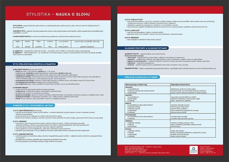 A clearly processed overview of the curriculum for teachers according to the needs of students. A clearly processed overview of stylistics for students in the second stage of elementary school. Styles of written and spoken expression, functional styles of the literary language - detailed processing - informative, administrative, scientific, journalistic, artistic, and rhetorical styles. Detailed processing of stylistic procedures and forms. The overview table is intended for students in the first and second stages. The overview table is a helper for students with special educational needs. The overview table is suitable for students preparing for multi-year gymnasiums.