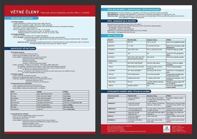 A clearly processed overview of the curriculum for teachers according to the needs of students. Overview table – Sentence members – a comprehensive overview of sentence structures, basic sentence members, developing sentence members, simple sentences and compound sentences, subordinate clauses, semantic relationships between main sentences. • The overview table is intended for students in the first and second stages. • The overview table is a helper for students with special educational needs. • The overview table is suitable for students preparing for multi-year gymnasiums.